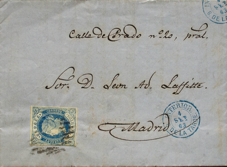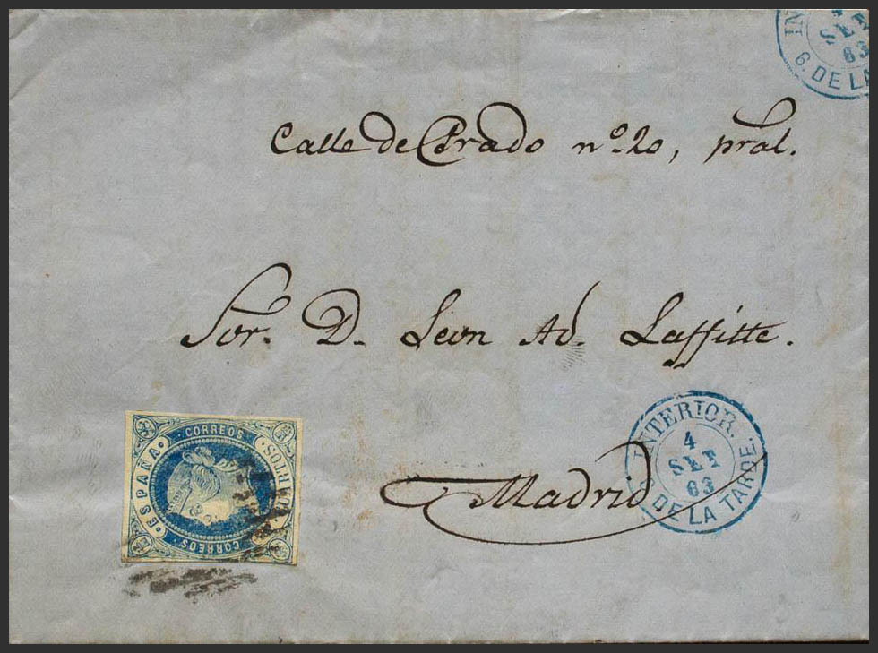 57. 1863. 2 cuartos blue. Internal Mail of MADRID. On the INTERIOR front / 6 PM, in blue. MAGNIFICENT.