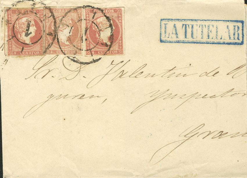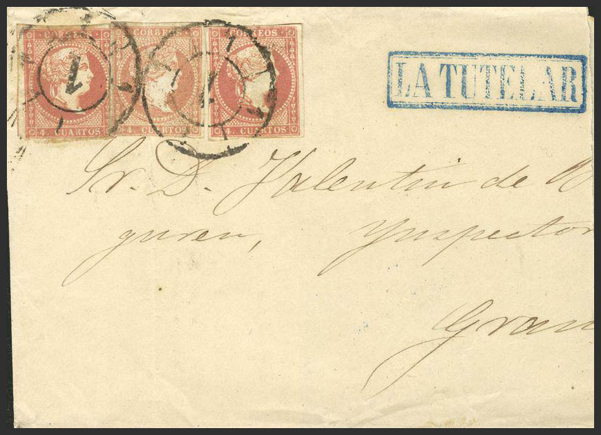 48(3). 1856. 4 red cuartos , three stamps. MADRID to GRANADA. Postmark R. CARRETA Nº 1. MAGNIFICENT.