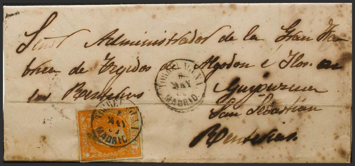 52. 1862. 4 orange cuartos . TORRELAGUNA to RENTERIA. Postmark TORRELAGUNA / MADRID. MAGNIFICENT.