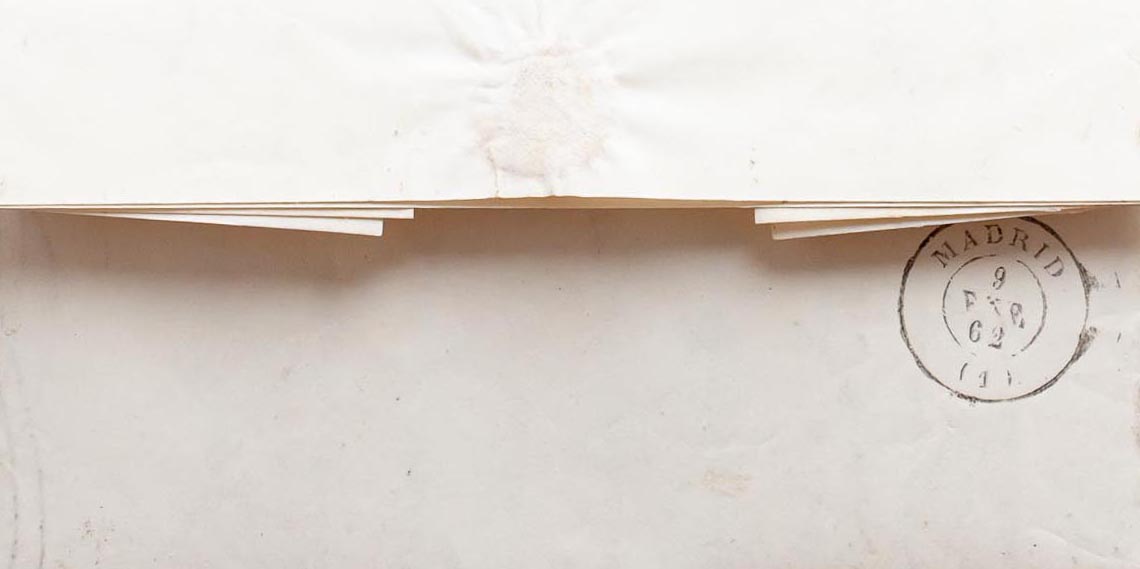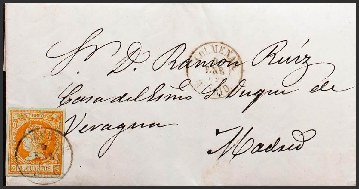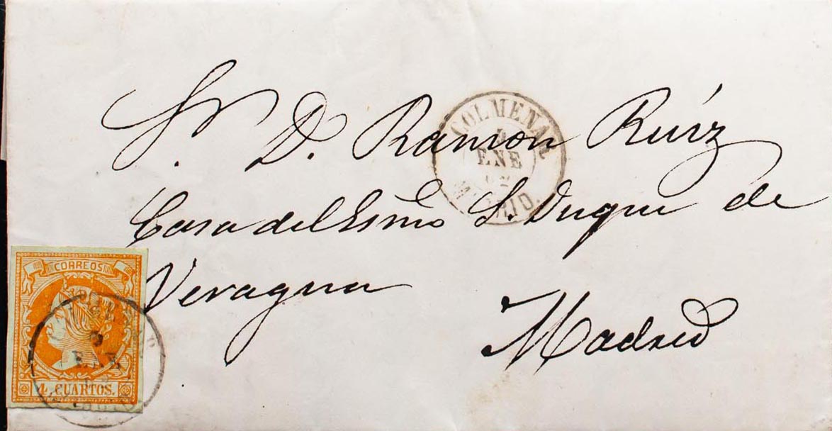 52. 1862. 4 orange cuartos . COLMENAR VIEJO to MADRID. COLMENAR / MADRID postmark. MAGNIFICENT AND VERY RARE.