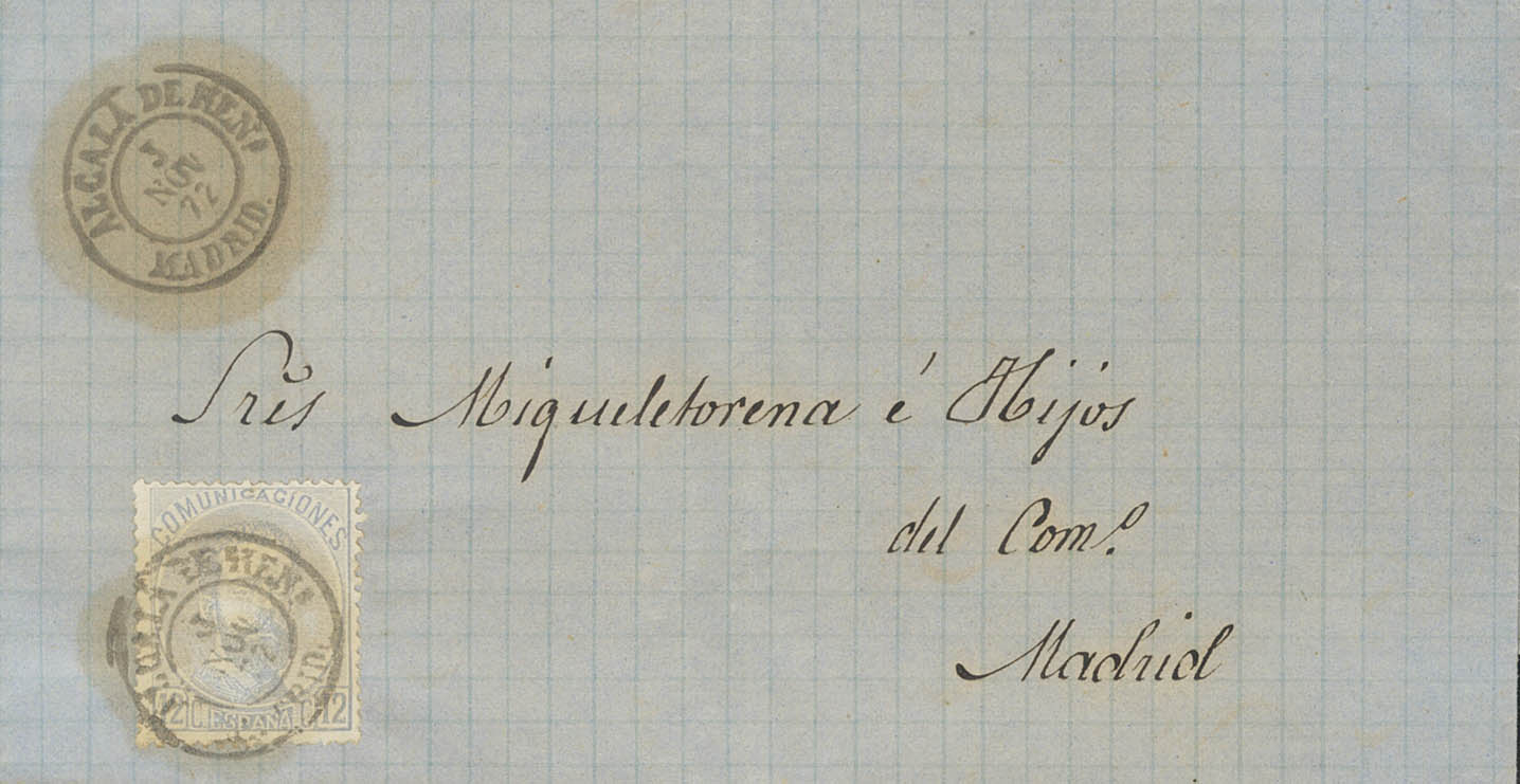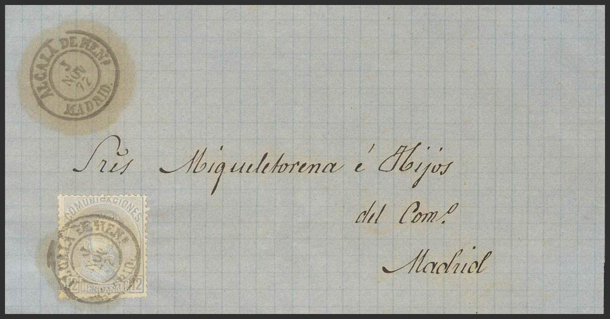 122. 1872. 12 cts gray lilac. ALCALA DE HENARES to MADRID. ALCALA DE HENS postmark. / MADRID (Very rare large type). MAGNIFICENT AND RARE SINGLE CARRY RATE THAT WAS ONLY IN EFFECT FOR THREE MONTHS.