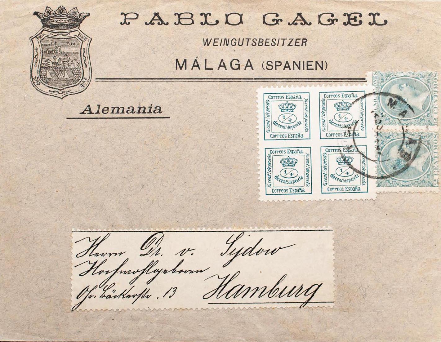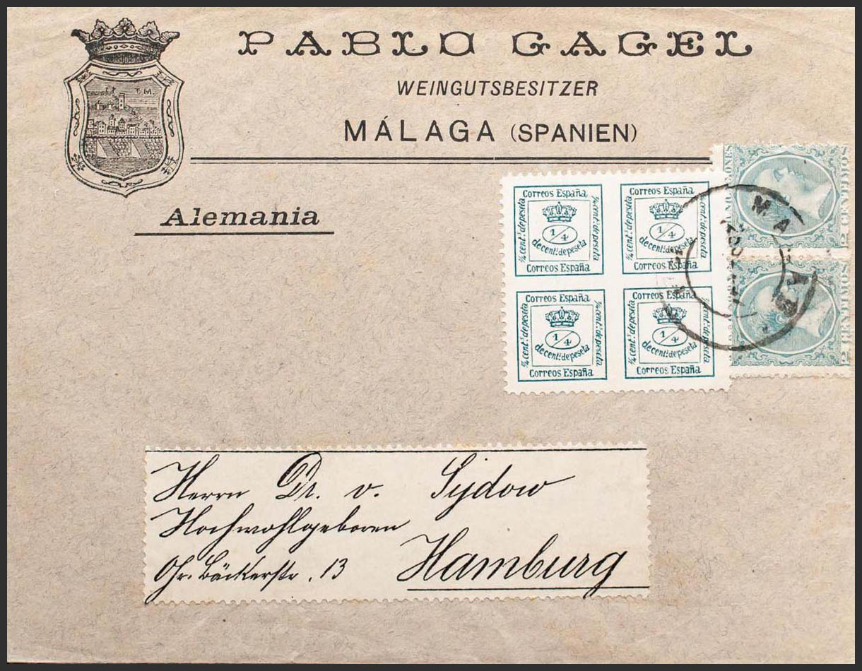 213(2), 173. 1897. 2 cts green, two hallmarks and 4/4 cts green PRIVATE TOOTH. MALAGA to HAMBURG. MAGNIFICENT.
