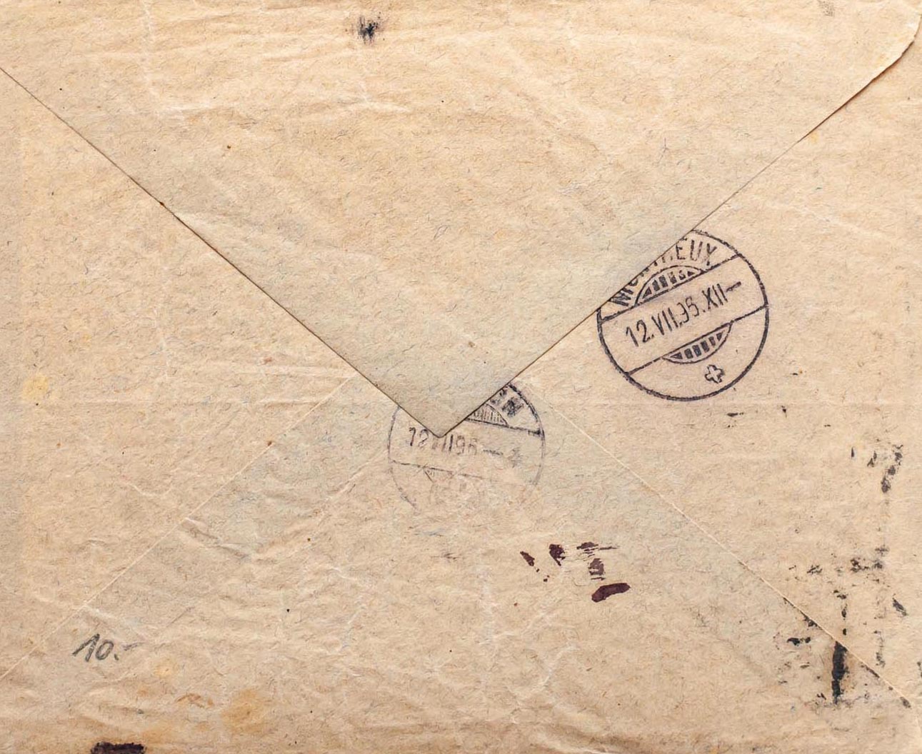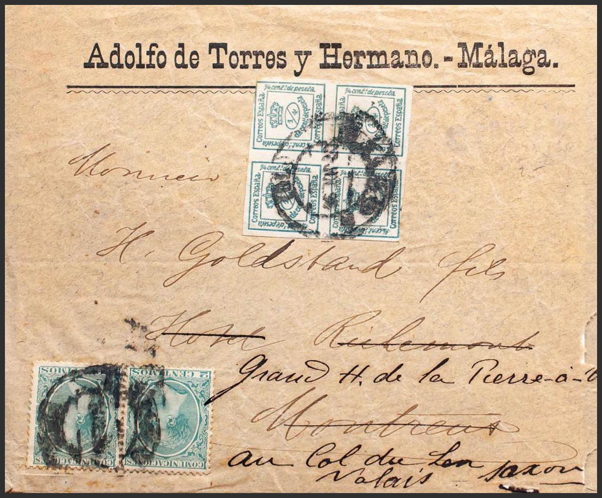 213(2), 173. 1896. 2 cts green, two stamps and 4/4 cts green. MALAGA to MONTREUX (SWITZERLAND), forwarded to SAXON (VALAIS). Arrivals on the back. MAGNIFICENT.