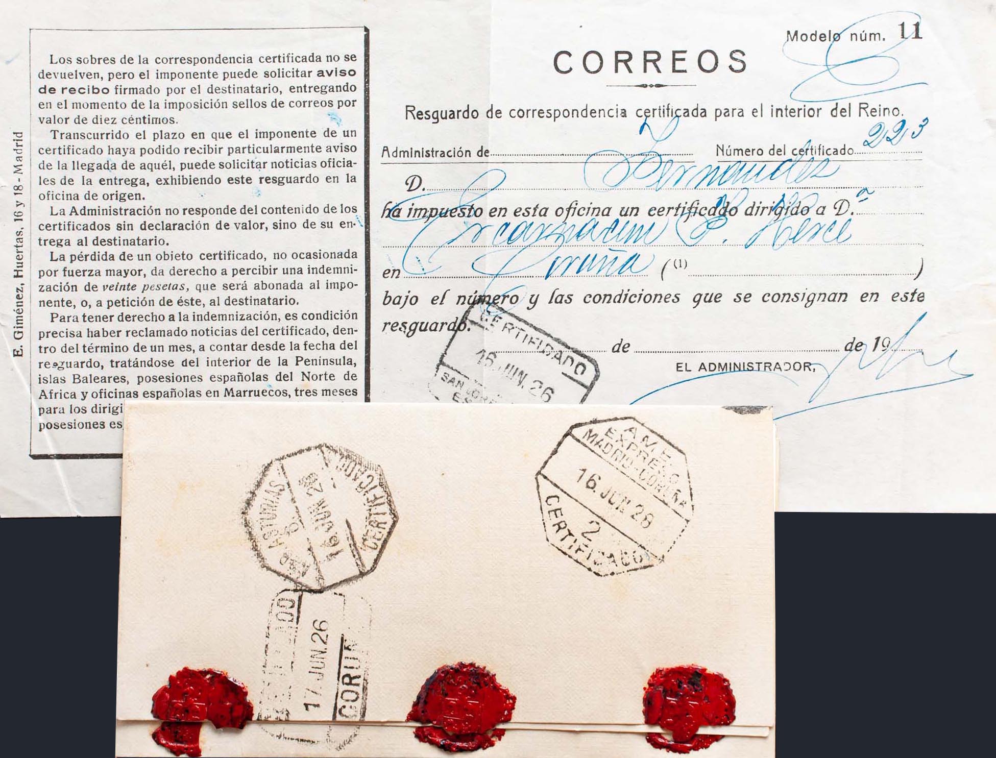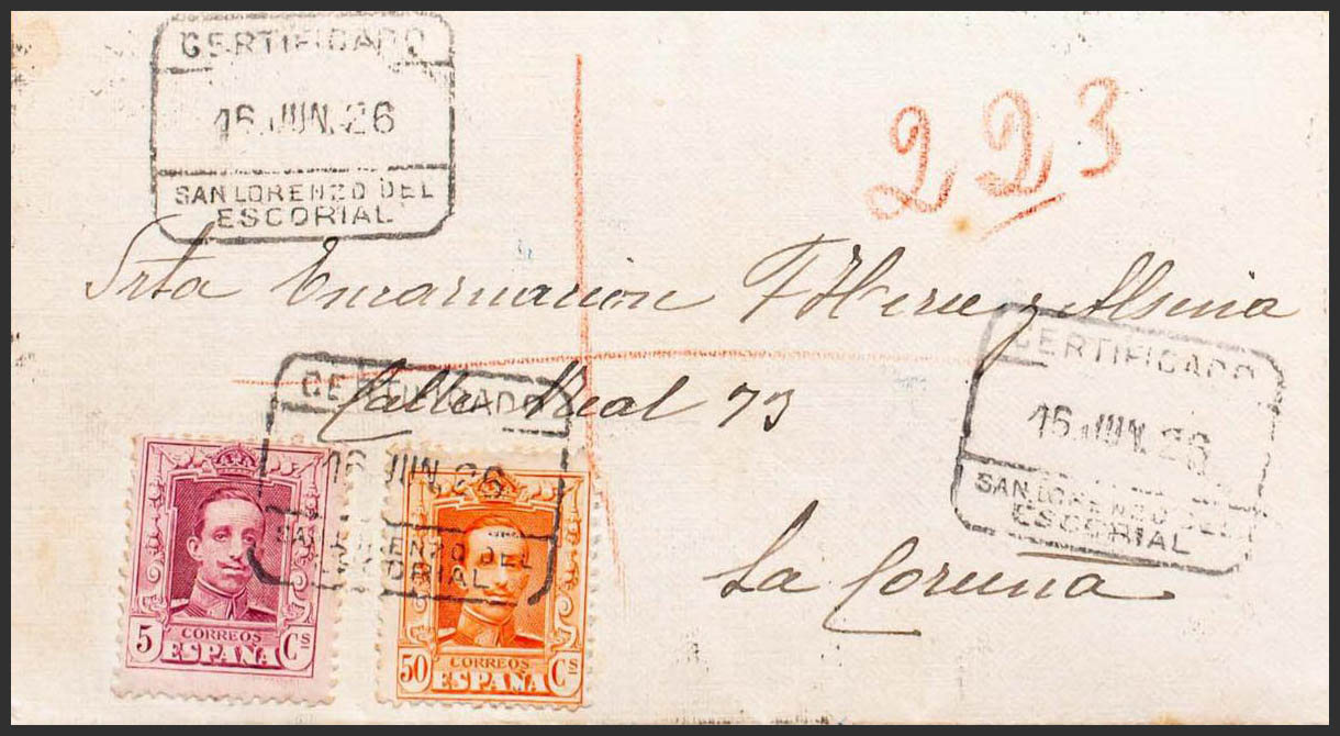 312, 320. 1926. 5 cts carmine and 50 cts orange. Certificate from SAN LORENZO DEL ESCORIAL to LA CORUÑA, includes receipt of the certification. On the back arrival. MAGNIFICENT.