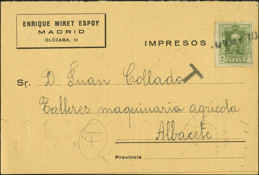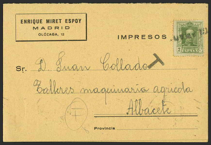 310. 1924. 2 cts. green. Advertising postcard from MADRID to ALBACETE. Postmark RECLAMADO, on the back mark ADMON. CENTRAL POST OFFICE / LIST. MAGNIFICENT.
