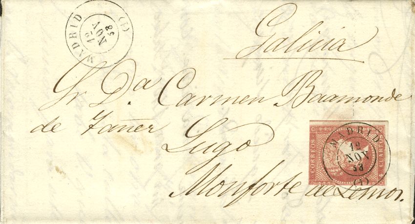 48. 1858. 4 red cuartos . MADRID to MONFORTE. Postmark MADRID / (1). MAGNIFICENT.