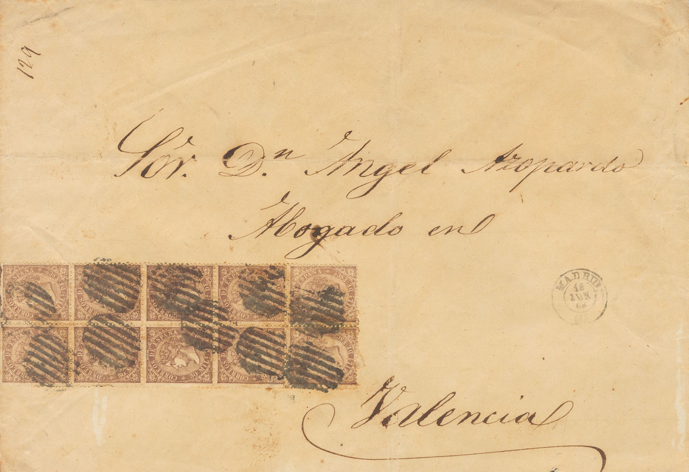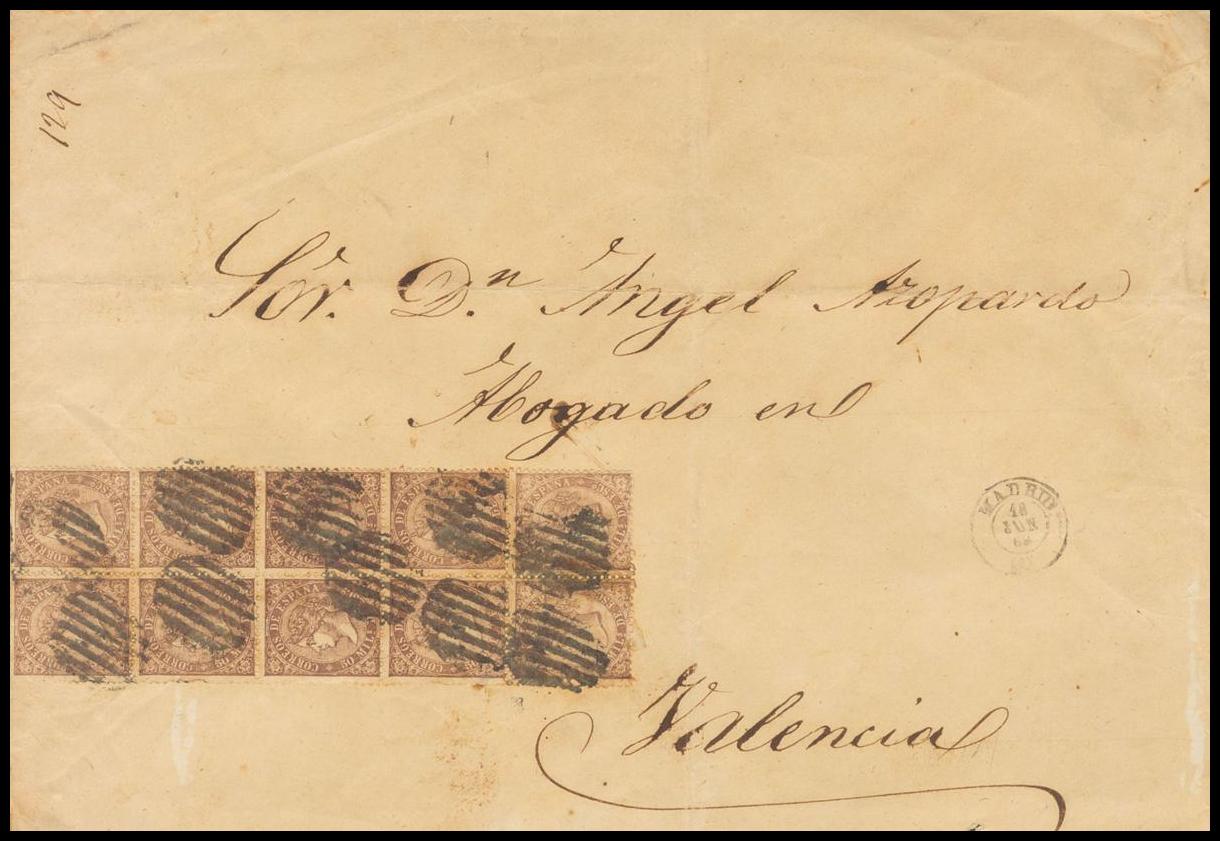 98(10). 1869. 50 mils violet, block of ten. MADRID to VALENCIA. MAGNIFICENT AND SPECTACULAR TEN-POST POSTAGE.