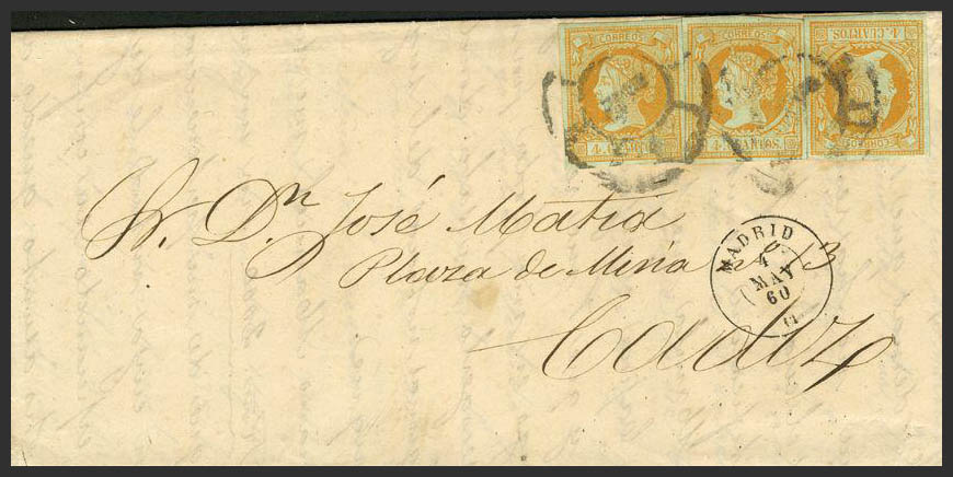 52(3). 1861. 4 yellow cuartos , three stamps. MADRID to CADIZ. Triple bearing. MAGNIFICENT.