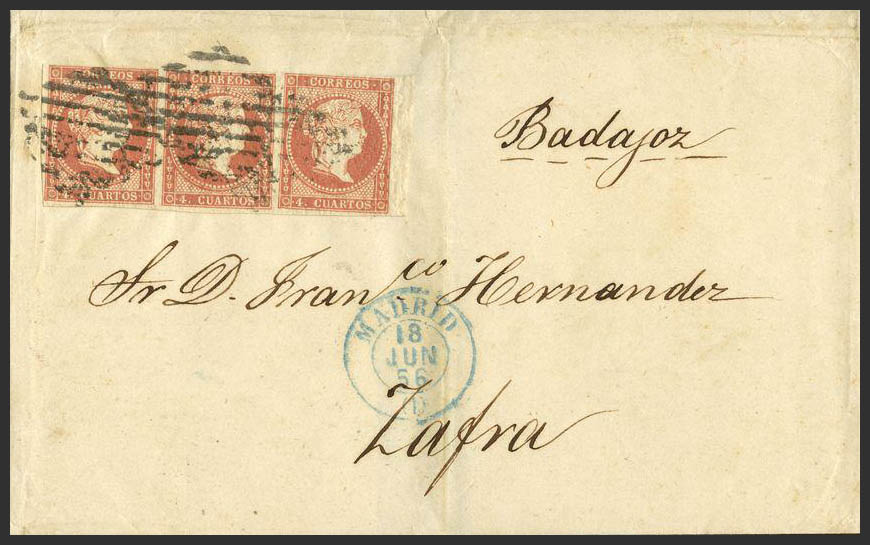 48(3). 1857. 4 red cuartos , strip of three. MADRID to ZAFRA. Triple bearing. MAGNIFICENT.
