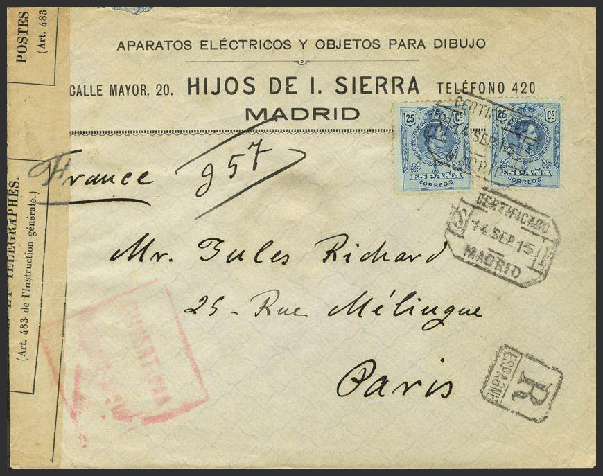 274(2). 1915. 25 blue cts, two stamps. Certificate from MADRID to PARIS. MAGNIFICENT.