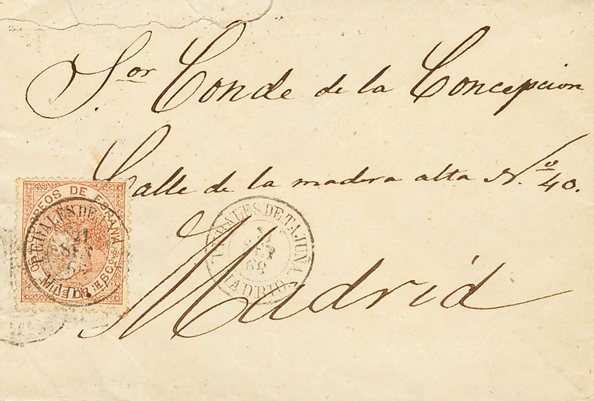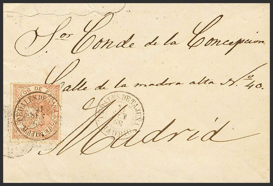 96. 1868. 50 mils chestnut. PEAR TREES FROM TAJUÑA to MADRID. Postmark PERALES DE TAJUÑA / MADRID. MAGNIFICENT.