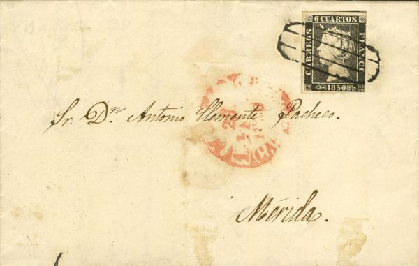 1A. 1850. 6- cuartos black. MADRID to MERIDA. Postmark PARRILLA, from Madrid. MAGNIFICENT AND RARE.