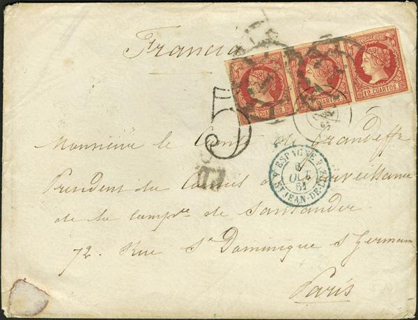 59(6). 1863. 12 blue cuartos , two strips of three (one of them on the back). MADRID to PARIS (FRANCE). On the front it marks POSTAGE / INSUFFICIENT, in red and portage "4" handwritten, both crossed out when checking the postage was on the back of the letter. MAGNIFICENT AND EXTREMELY RARE POSTAGE OF SIX POSTAGE TO FRANCE IN THIS ISSUE. Certificate GRAUS.