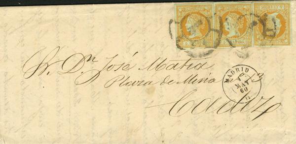 52(3). 1861. 4 yellow cuartos , three stamps. MADRID to CADIZ. Triple bearing. MAGNIFICENT.