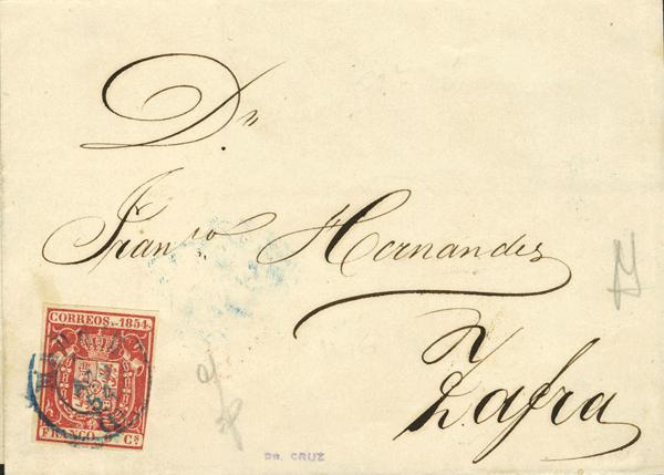 24. 1854. 6 red cuartos . MADRID to ZAFRA. Postmark MADRID / (1) (Type I), in blue. MAGNIFICENT AND RARE.