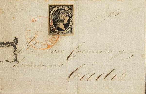 6. 1851. 6 cuartos black. MADRID to CADIZ. MADRID baeza postmark, applied to the stamp as the only postmark, on the front and respecting the baeza postmark the spider was stamped. MAGNIFICENT AND VERY RARE USE OF THE BAEZA AS THE ONLY OBLITERATION OF THE 6 ROOMS OF 1851.