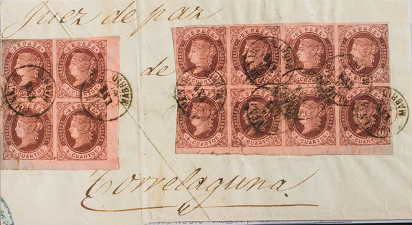 58(12). 1862. 4 chestnut cuartos , block of eight and four. Judicial Escrow from COLMENAR (MADRID) to TORRELAGUNA (MADRID). Postmark COLMENAR / MADRID. MAGNIFICENT AND RARE.
