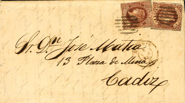 58(2). 1863. 4 chestnut cuartos , two stamps. MADRID to CADIZ. GRILL postmark. MAGNIFICENT AND RARE.
