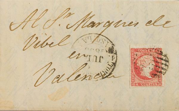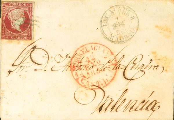 48. 1856. 4 red cuartos . TORRELAGUNA to VALENCIA. On the baeza front TORRELAGUNA / CAST. THE MAGNIFICENT N.