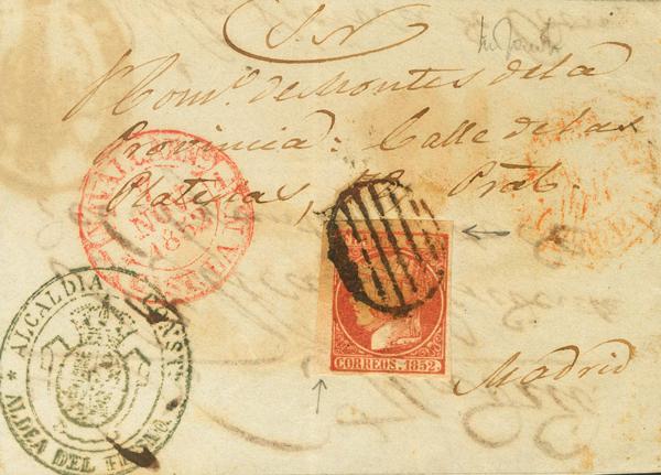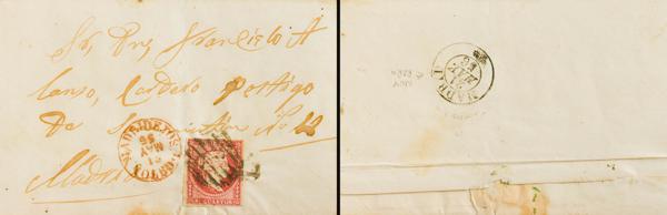 44. 1856. 4 red cuartos . MADRIDEJOS to MADRID. On the front MADRIDEJOS / TOLEDO, in red and on the back modified date MADRID / *, in black. MAGNIFICENT AND RARE MODIFIED ARRIVAL DATE.