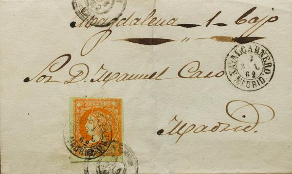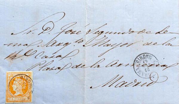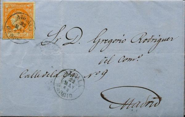 52. 1862. 4 orange cuartos . NAVALCARNERO to MADRID. Postmark NAVALCARNERO / MADRID. MAGNIFICENT AND RARE.