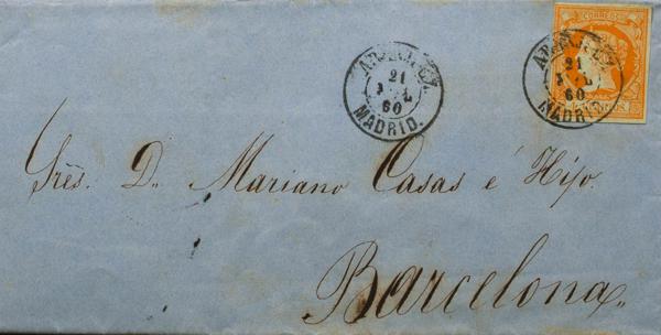 52. 1860. 4 orange cuartos . ARANJUEZ to BARCELONA. Postmark ARANJUEZ / MADRID. MAGNIFICENT.