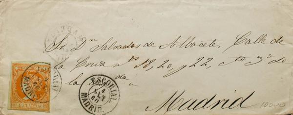 |ENVELOPE| 52. 1860. 4 orange quarters. EUncirculatedORIAL to MADRID. Postmark EUncirculatedORIAL / MADRID. MAGNIFICENT.