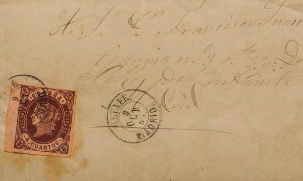 58. 1863. 4- cuartos chestnut. MADRID to ALICANTE. Postmark MADRID / (1). MAGNIFICENT AND RARE.
