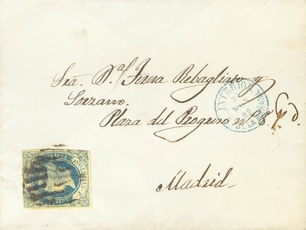 44. 1859. 4 red cuartos . MADRID to GIJON. Postmark R. CARRETA Nº1. MAGNIFICENT AND RARE USE OF THE CART WHEEL ON THIS ISSUE, IN THE EDIFIL CATALOG IT DOES NOT APPEAR REVIEWED IN THE LETTER.