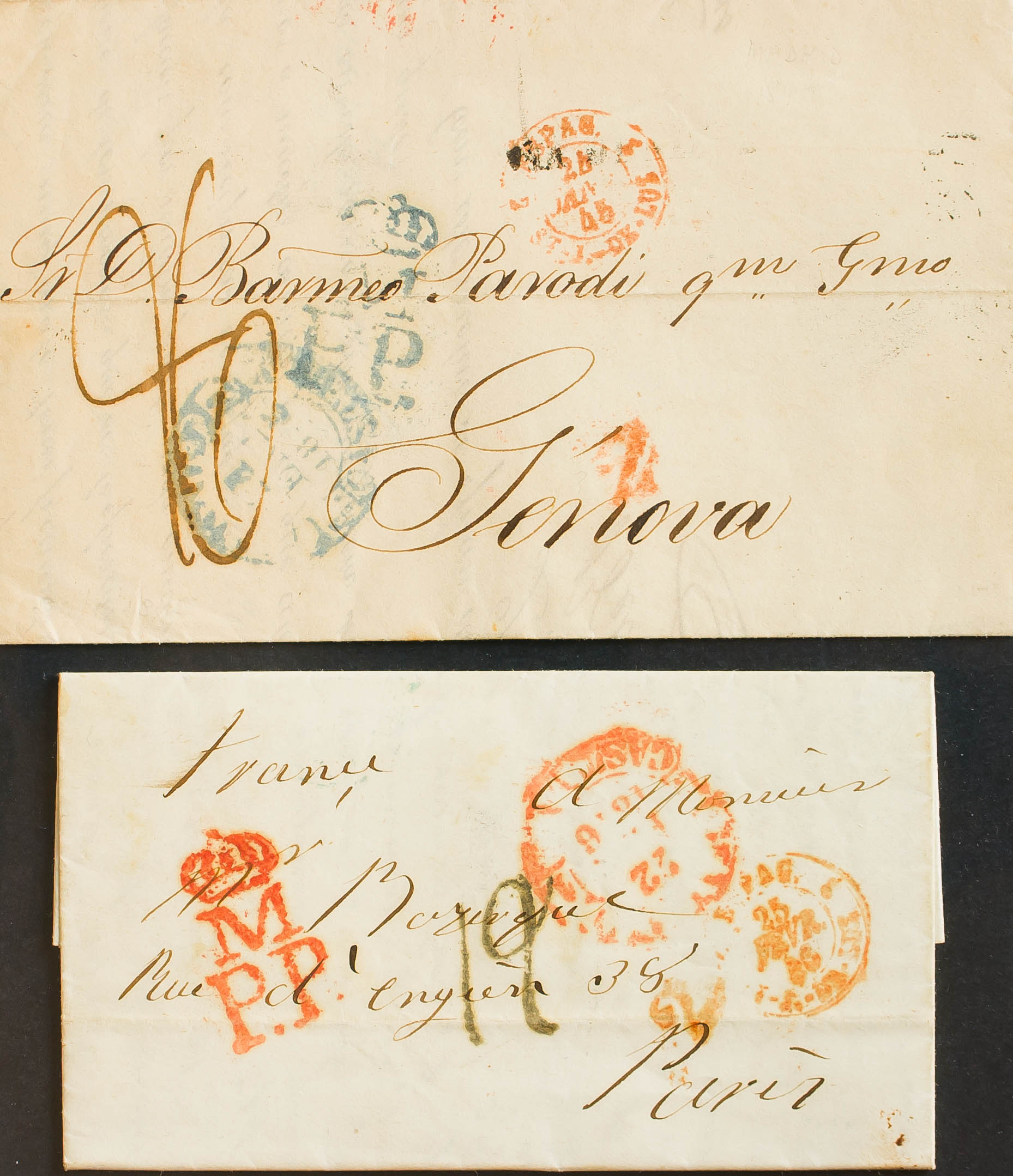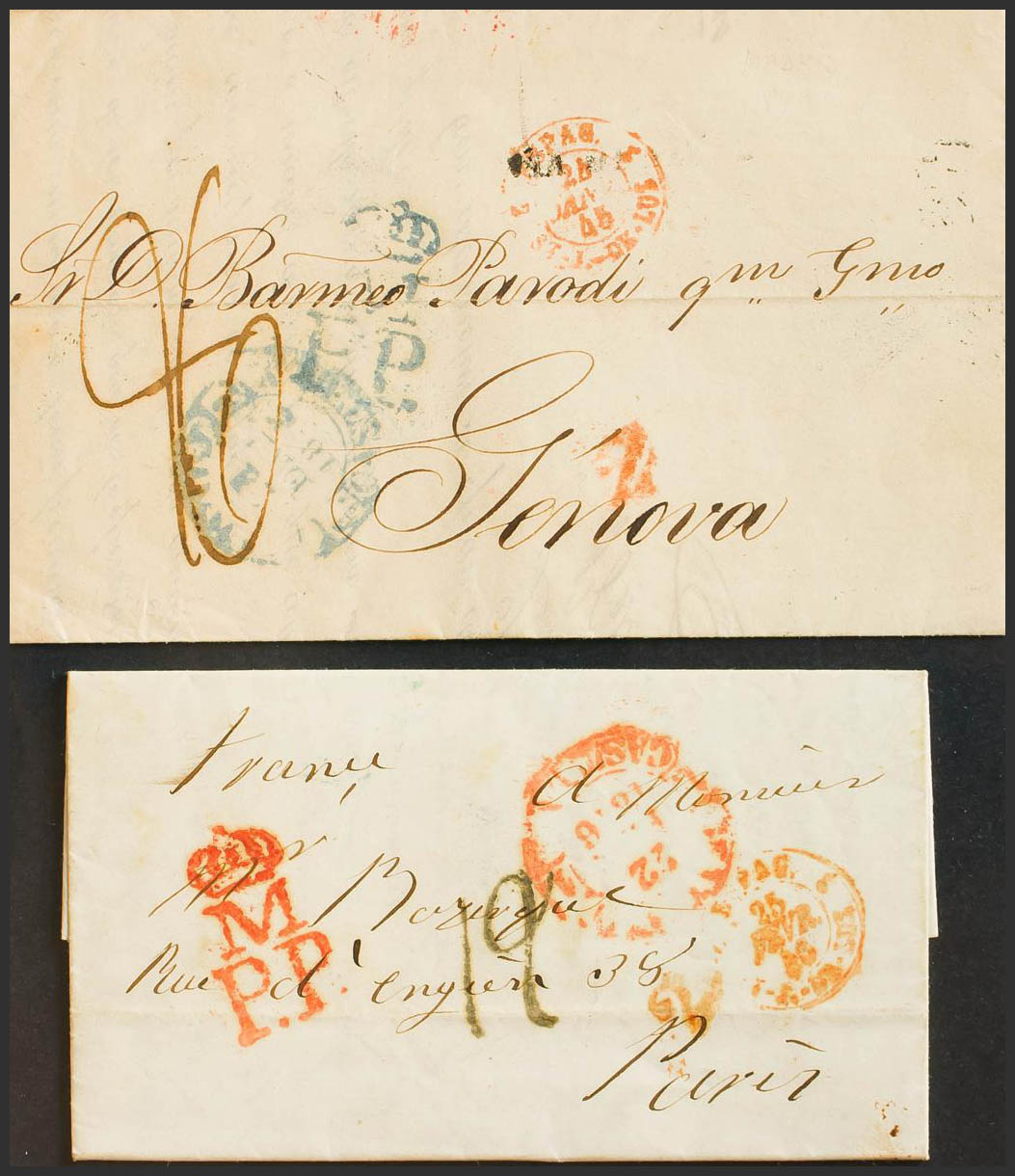 1846. Two letters originating in MADRID and destined for PARIS (FRANCE) and GENOVA (ITALY), respectively, both with the M. / PP mark, in red and blue on each of them (PE85) 2004 edition. MAGNIFICENT.