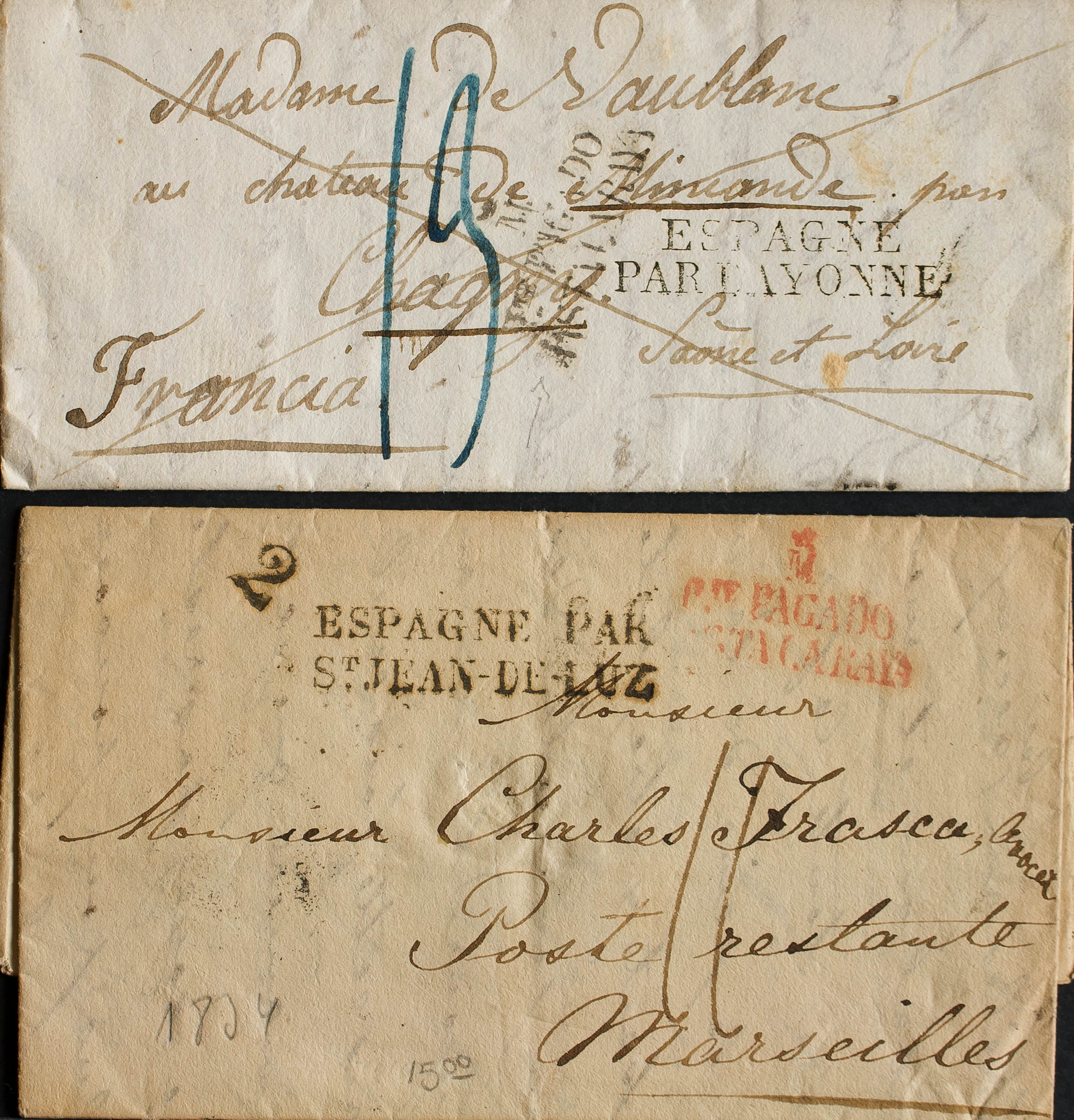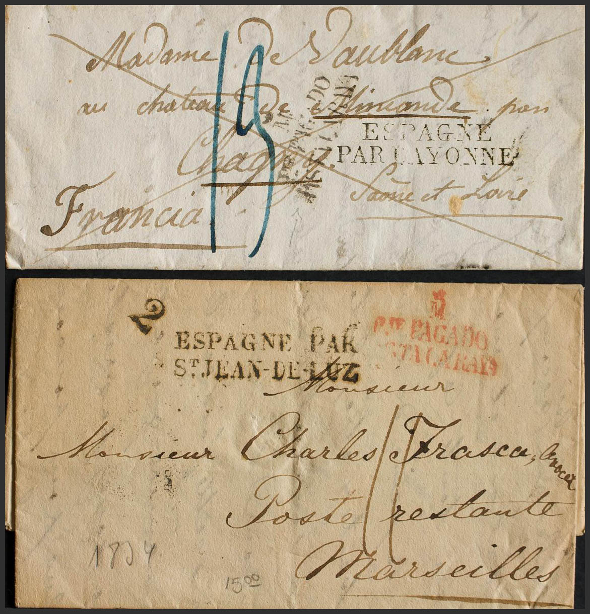 1823. Set of two letters from MADRID to FRANCE with the PTE mark. PAID / UNTIL THE LINE, in black and red respectively (PE83) 2004 edition. MAGNIFICENT.