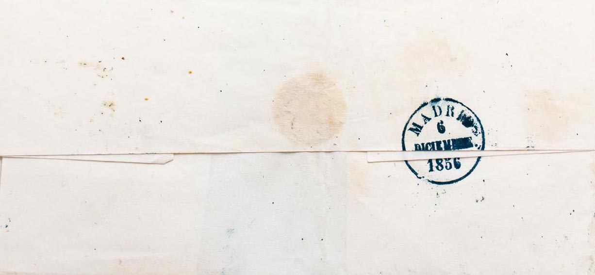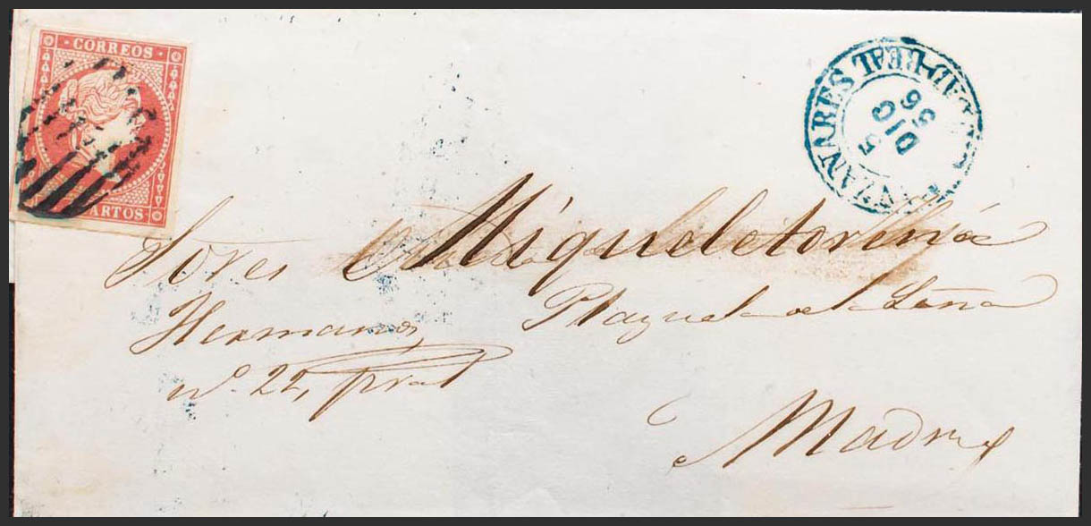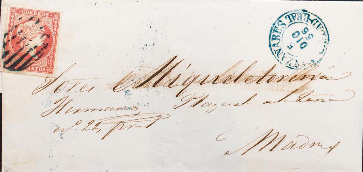 48. 1856. 4 cuartos red. MANZANARES (CIUDAD-REAL) to MADRID. PARRILLA postmark, in blue and on the back experimental date MADRID / DECEMBER 6, 1856, in blue. MAGNIFICENT AND RARE. Cert. GRAUS.