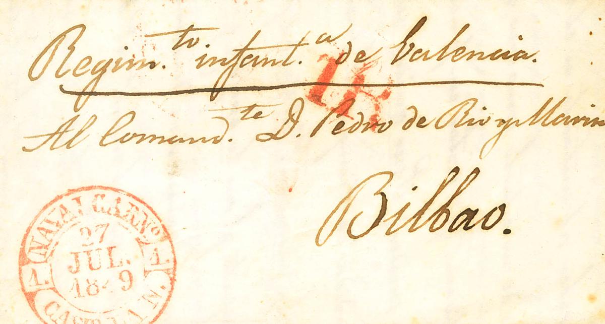 |ABOUT|1849. VILLA DEL PRADO (MADRID) to BILBAO. Baeza NAVALCARNº / CAST.LA N, in red. MAGNIFICENT PRINTING.