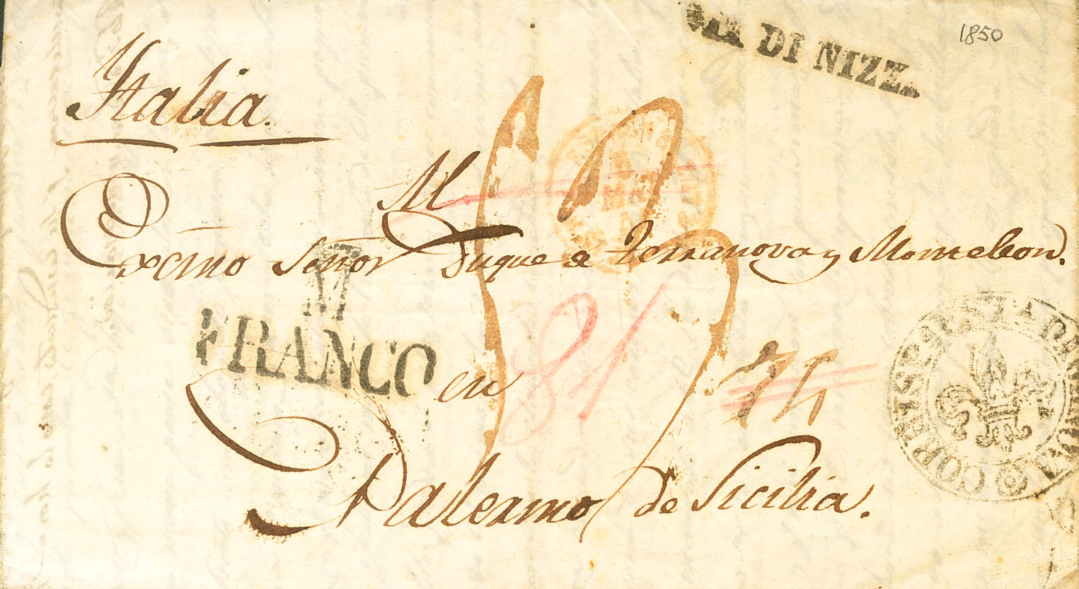 |ABOUT|1850. (May 2). MADRID to PALERMO (SICILY). Mark M / FRANCO, in black (PE26) 2004 edition and various Italian transit and arrival marks on the obverse and reverse. MAGNIFICENT AND RARE.