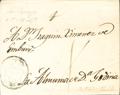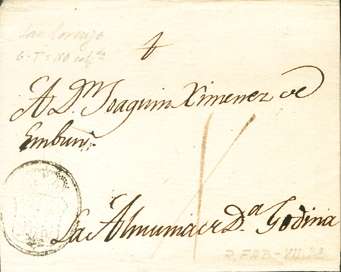 English |ENVELOPE|(1798ca). Addressed to ALMUNIA DE DOÑA GODINA. CORREO REAL (PE45) mark, 2004 edition, and cross-shaped ink strokes to indicate the franchise. MAGNIFICENT AND VERY RARE.