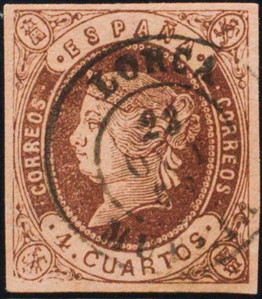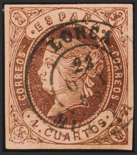 58. 1862. 4- cuartos chestnut. Postmark LORCA / MURCIA. MAGNIFICENT.