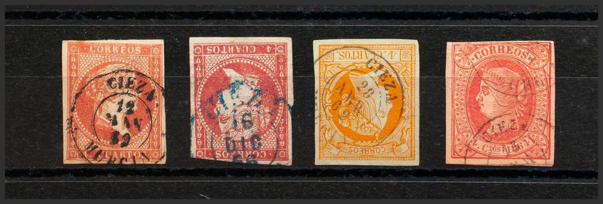 48(2), 52, 64. (1855ca). Set of four 4- cuartos red, yellow and pink stamps, unused with CIEZA / MURCIA postmark (including Type I, in blue on the 4- cuartos red). MAGNIFICENT.