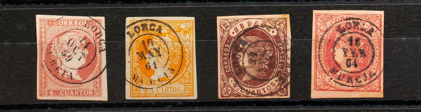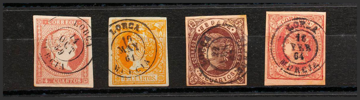 48, 52, 58, 64. (1855ca). Set of four 4- cuartos stamps red, yellow, brown and pink, unused with LORCA / MURCIA postmark. MAGNIFICENT.