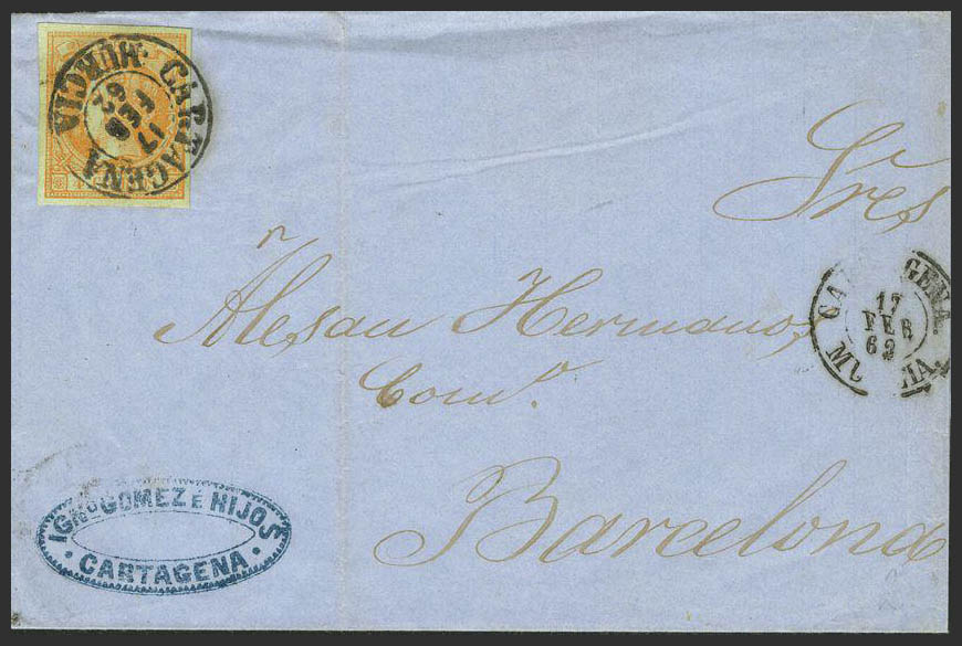 52. 1862. 4 cuartos yellow. CARTAGENA to BARCELONA. Postmark CARTAGENA / MURCIA (Type I), next to CARTAGENA / MURCIA. MAGNIFICENT.