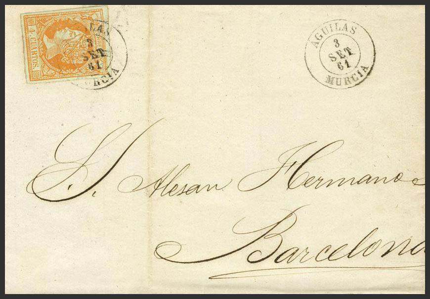 52. 1861. 4 cuartos yellow. EAGLES to BARCELONA. Postmark AGUILAS / MURCIA.