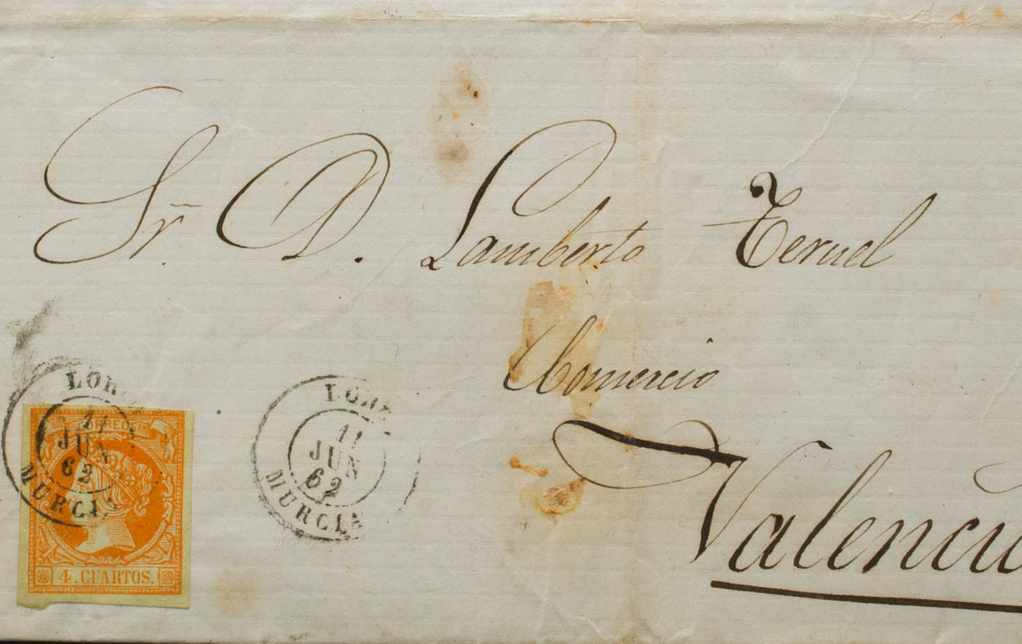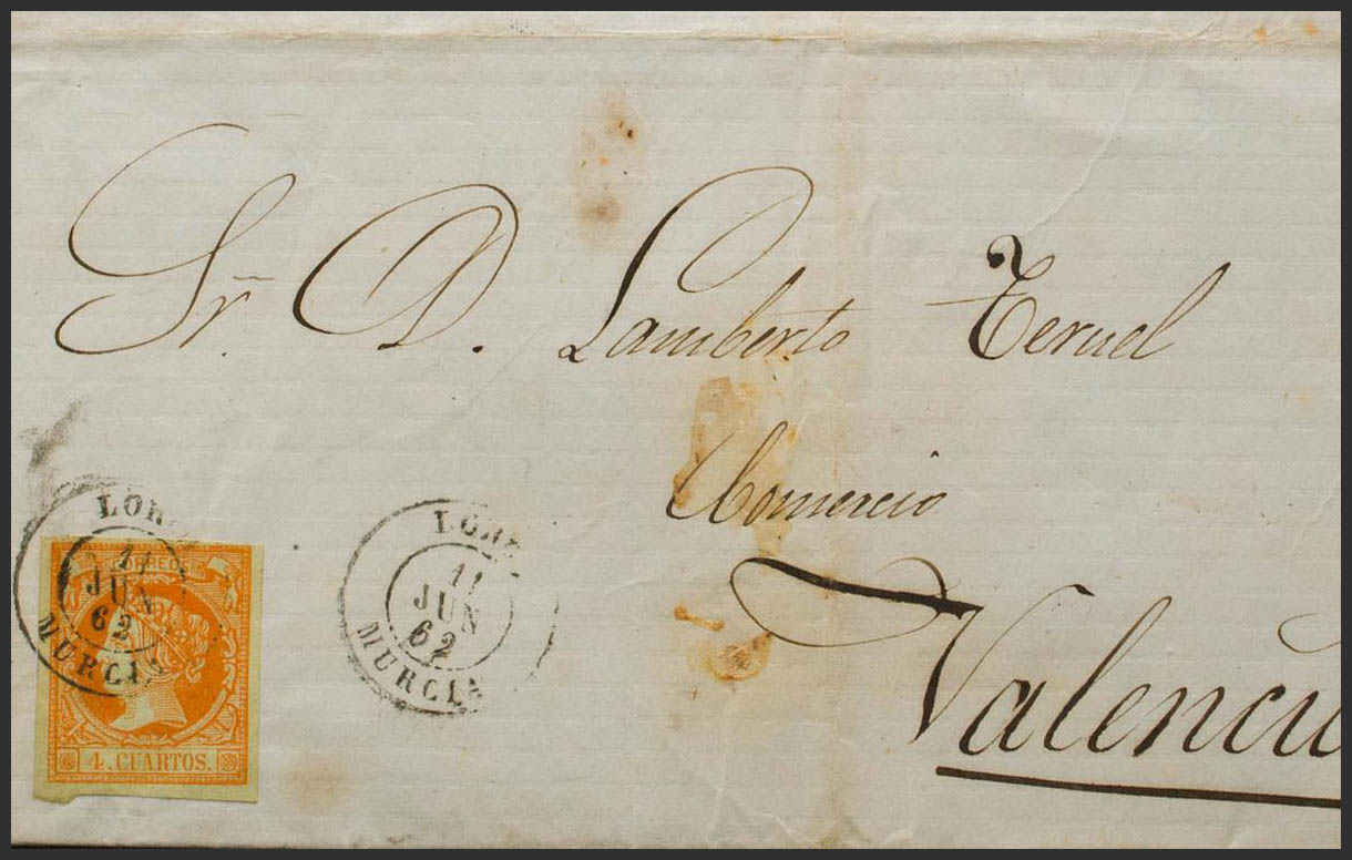 52. 1862. 4 orange cuartos . LORCA to VALENCIA. Postmark LORCA / MURCIA. MAGNIFICENT.