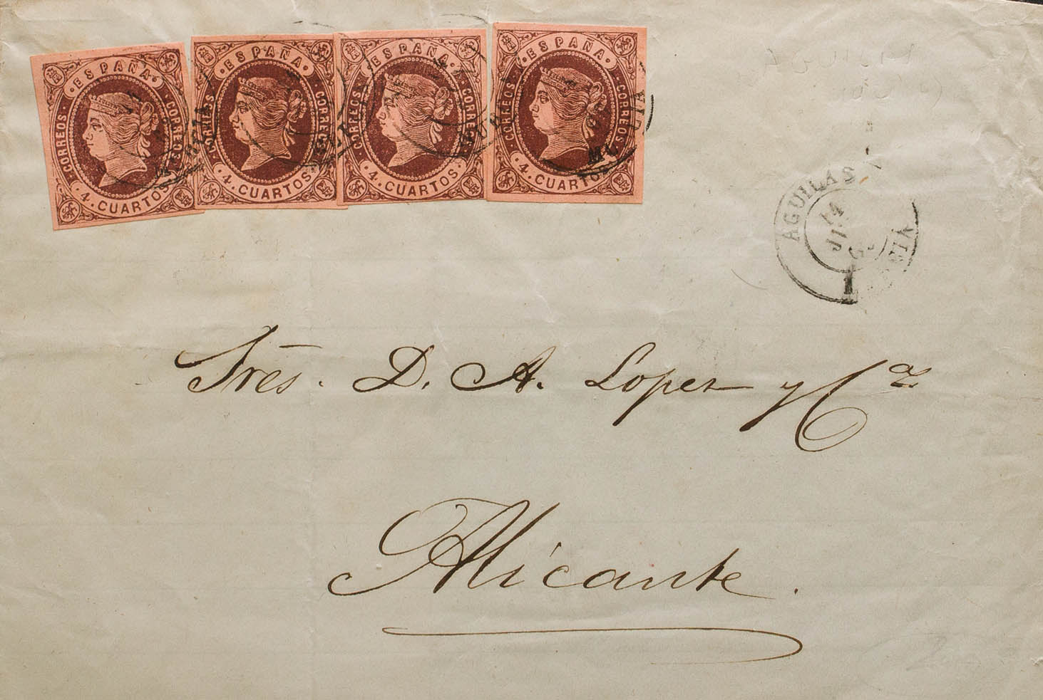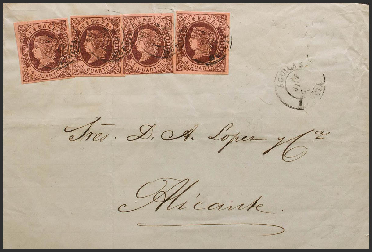 58(4). 1862. 4 chestnut cuartos , four stamps. EAGLES to ALICANTE. Postmark AGUILAS / MURCIA. MAGNIFICENT AND UNUSUAL QUADRUPLE SIZE.