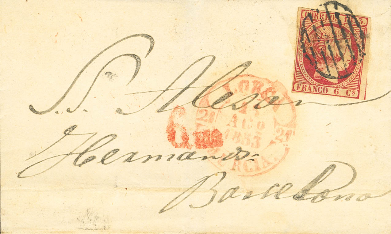 |ABOUT| 17. 1853. 6 carmine quarters. LOGoodA (MUGoodIA) to BAGoodELONA. On the Baeza front LOGoodA / MUGoodIA. MAGNIFICENT.