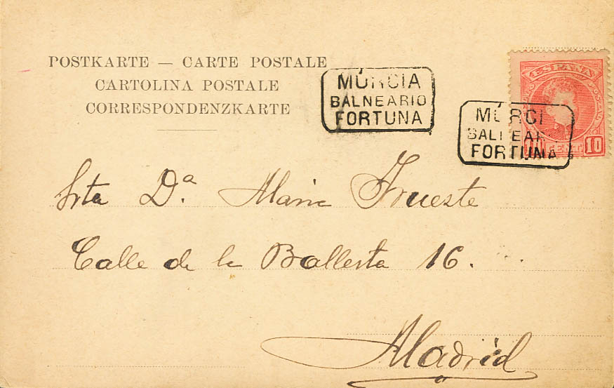 243. (1901ca). 10 ct red. Postcard from FORTUNA to MADRID. Postmark special postmark MURCIA / BALNEARIO / FORTUNA. MAGNIFICENT AND RARE.