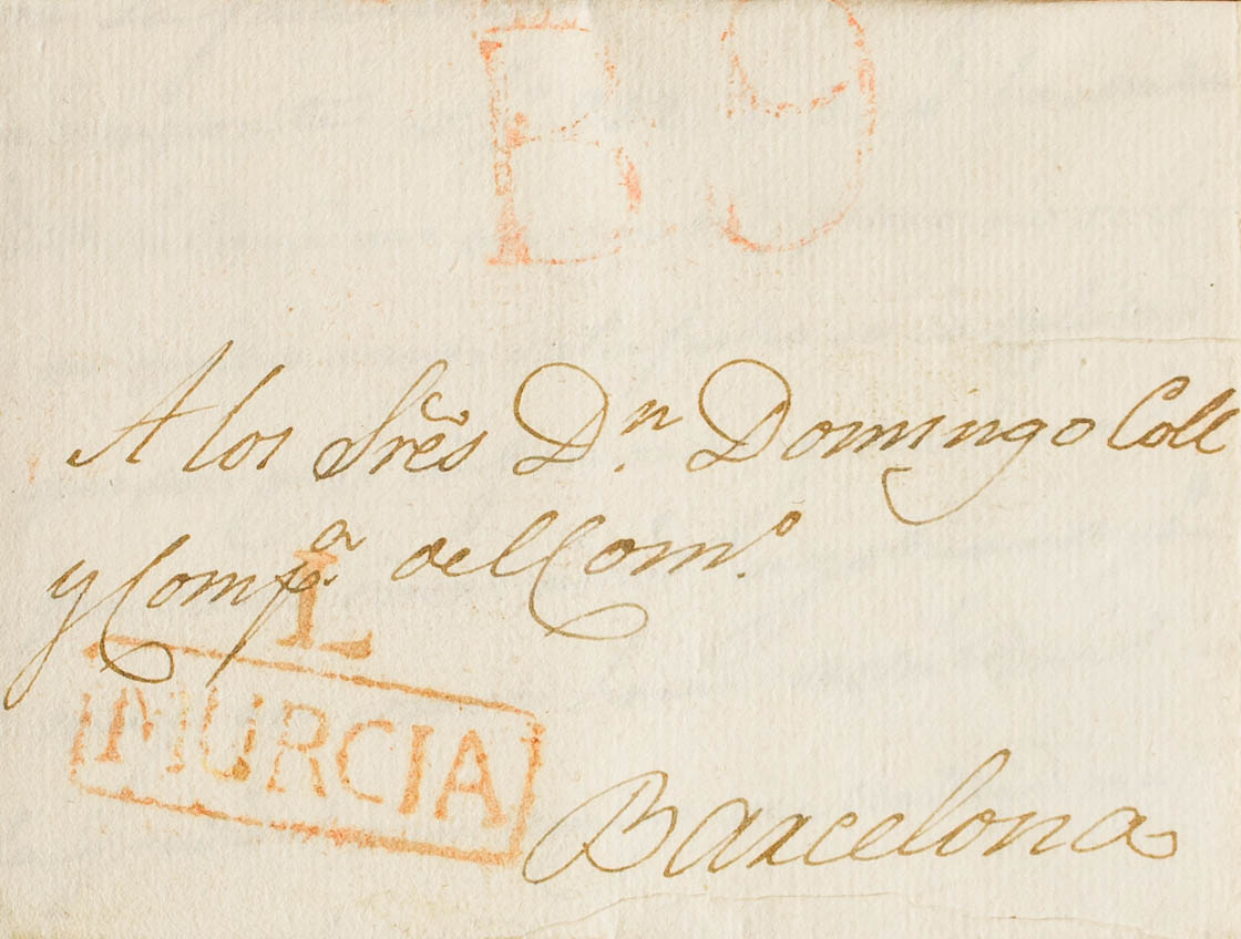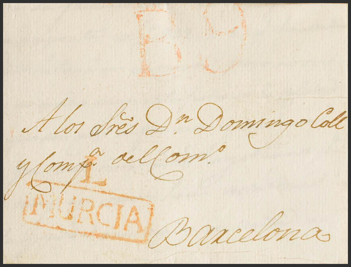 1821. LORCA to BARCELONA. Marca L. / MURCIA (PE3) 2004 edition. MAGNIFICENT.