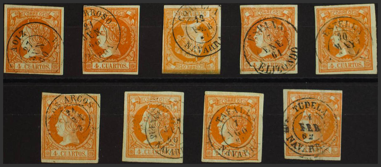 52(9). 1860. Set of nine unused yellow 4- cuartos stamps with the daters of the province of Navarra: AOIZ, CAPARROSO, CORELLA, ELIZONDO, ESTELLA, LOS ARCOS, PUENTE DE LA REINA, TAFALLA and TUDELA. MAGNIFICENT.