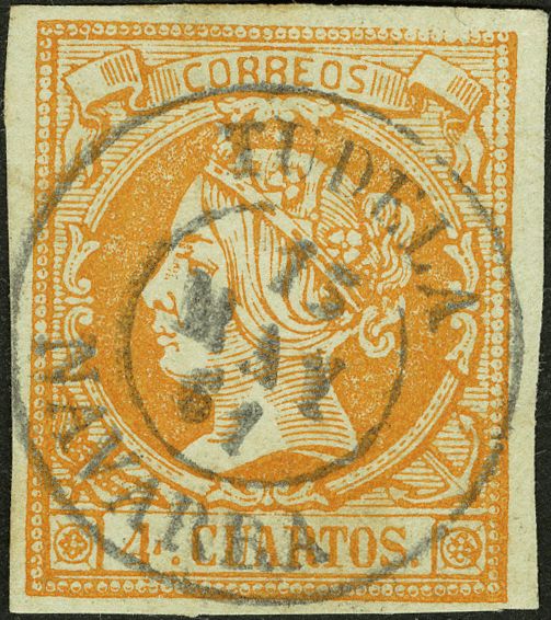 English 52. 1860. 4 cuartos yellow. Postmark TUDELA / NAVARRA. MAGNIFICENT.