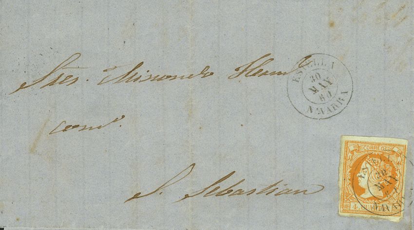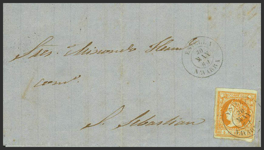 52. 1860. 4 cuartos yellow. STAR to SAINT SEBASTIAN. Postmark ESTELLA / NAVARRA.
