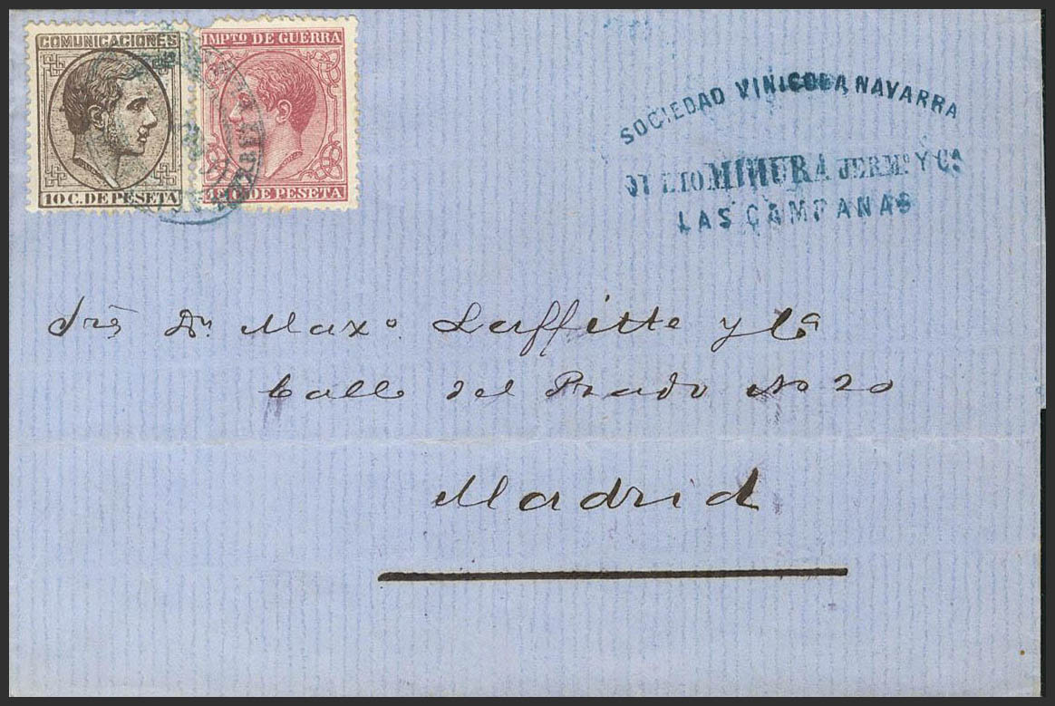 192, 188. 1878. 10 cts chestnut and 15 cts carmine. LAS CAMPANAS (NAVARRA) to MADRID. Special oval postmark CARTERIA DE / LAS CAMPANAS, in blue. MAGNIFICENT AND VERY RARE IN THIS ISSUE.