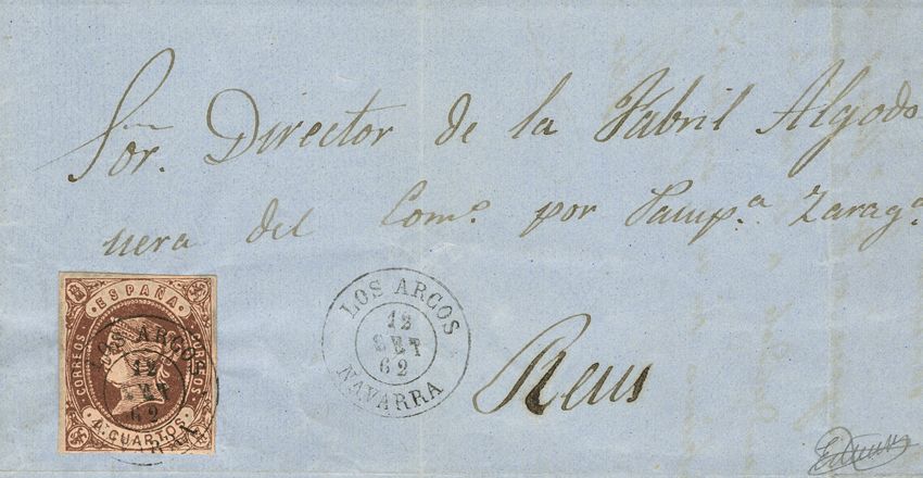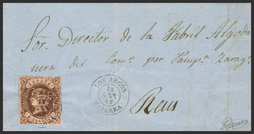 58. 1862. 4- cuartos chestnut. THE ARCHES to REUS. Postmark LOS ARCOS / NAVARRA. MAGNIFICENT.